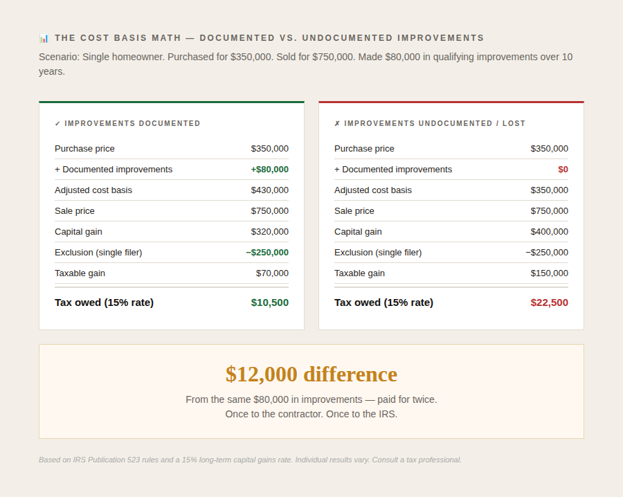 Difference: $12,000 — from the same $80,000 in improvements. Paid for twice. Once to the contractor. Once to the IRS.